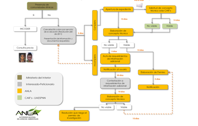 - La Autoridad Nacional de Licencias Ambientales - ANLA realiza el procedimiento para el otorgamiento del permiso en caso de que las actividades de investigación, se desarrollen en jurisdicción de dos o más de las autoridades ambientales