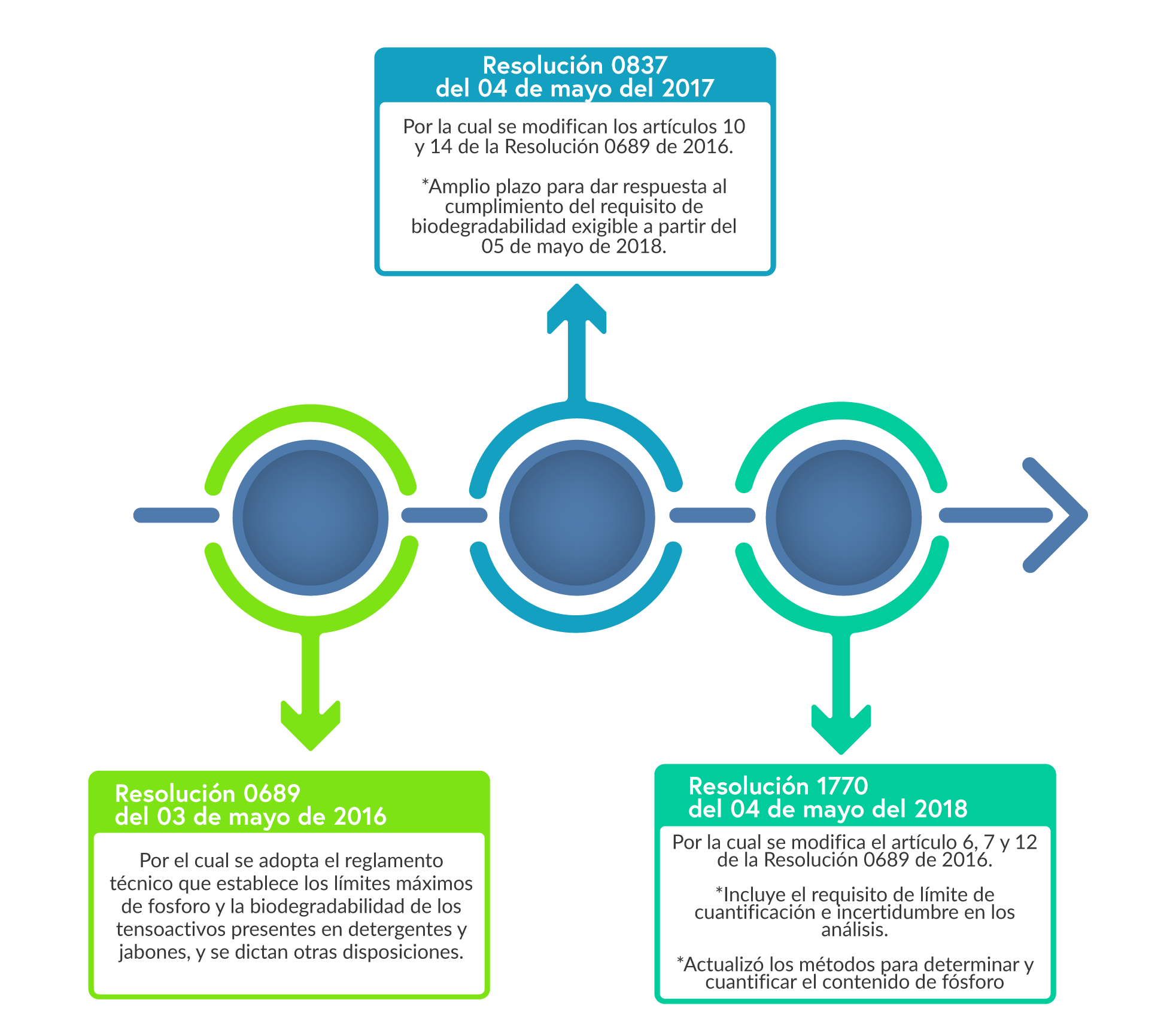 - Resolución 0689 de 2016 "Por la cual se adopta el reglamento técnico que establece los límites máximos de fósforo y la biodegradabilidad de los tensoactivos presentes en detergentes y jabones, y se dictan otras disposiciones". Ministerio de Salud y Protección Social y Ministerio de Ambiente y Desarrollo Sostenible.