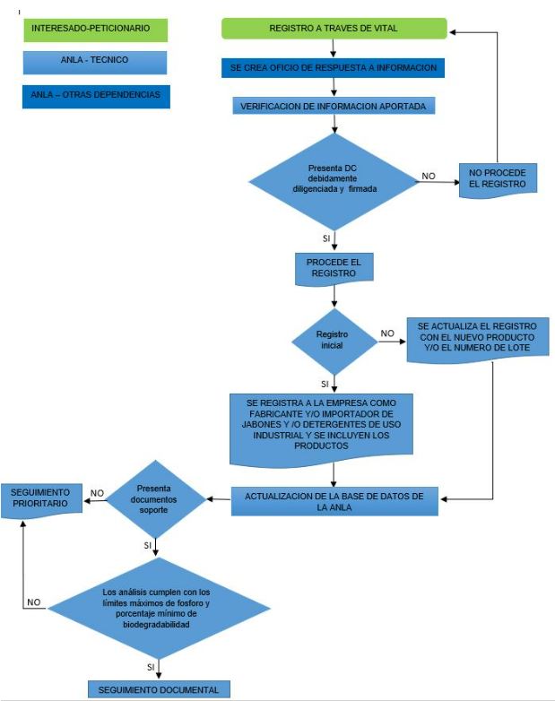 Adicionalmente, según lo descrito en el artículo 9 de la Resolución 0689 de 2016 es obligación de los fabricantes e importadores de detergentes y jabones de uso industrial informar ante la Autoridad Nacional de Licencias Ambientales – ANLA, a través del aplicativo denominado “Ventanilla Integral de Trámites Ambientales en Línea – VITAL, previo a la distribución, comercialización o a la importación de los productos sujetos al cumplimiento del reglamento técnico como mínimo la siguiente información: