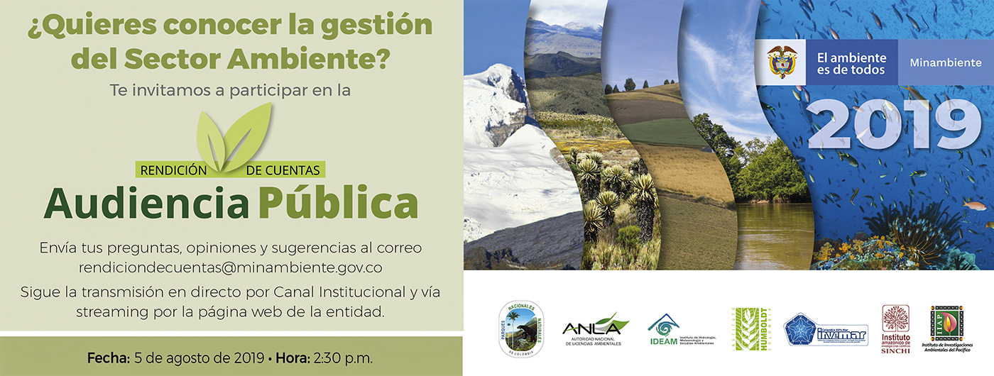 - Audiencia Pública de Rendición de Cuentas del Sector Ambiente y Desarrollo Sostenible (agosto 2018-junio 2019), la cual se realizó el día 05 de agosto de 2019, en el Estudio 5 de RTVC Sistema de Medios Públicos, ubicado en la Av. El Dorado Cr. 45 # 26 – 33, Bogotá – Colombia.