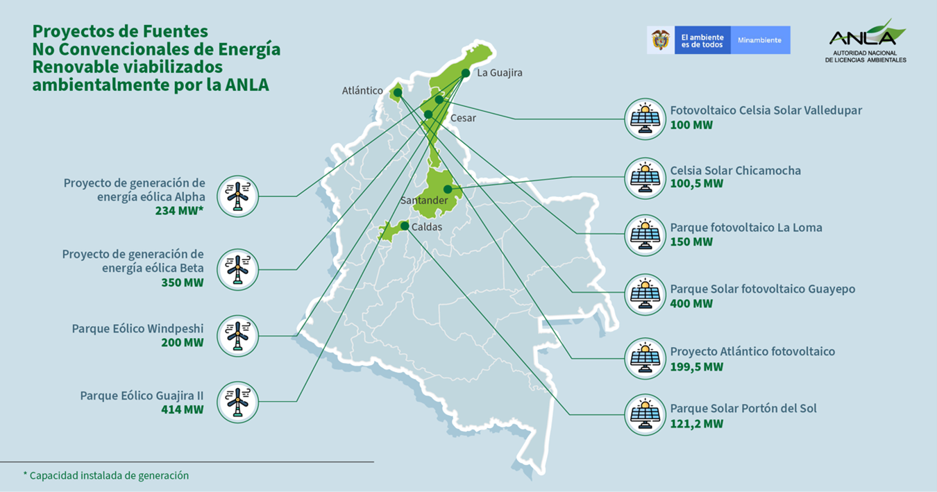Según lo señalado por Rodrigo Suárez Castaño, director general de la ANLA, “ya son 10 los proyectos de Fuentes No Convencionales de Energía Renovable licenciados por la ANLA, que generarán aproximadamente 2.269 MW, aportando a la consolidación de la meta de transición energética en el territorio nacional y lo que nos ubica como un referente en la región en la implementación de este tipo de proyectos”.