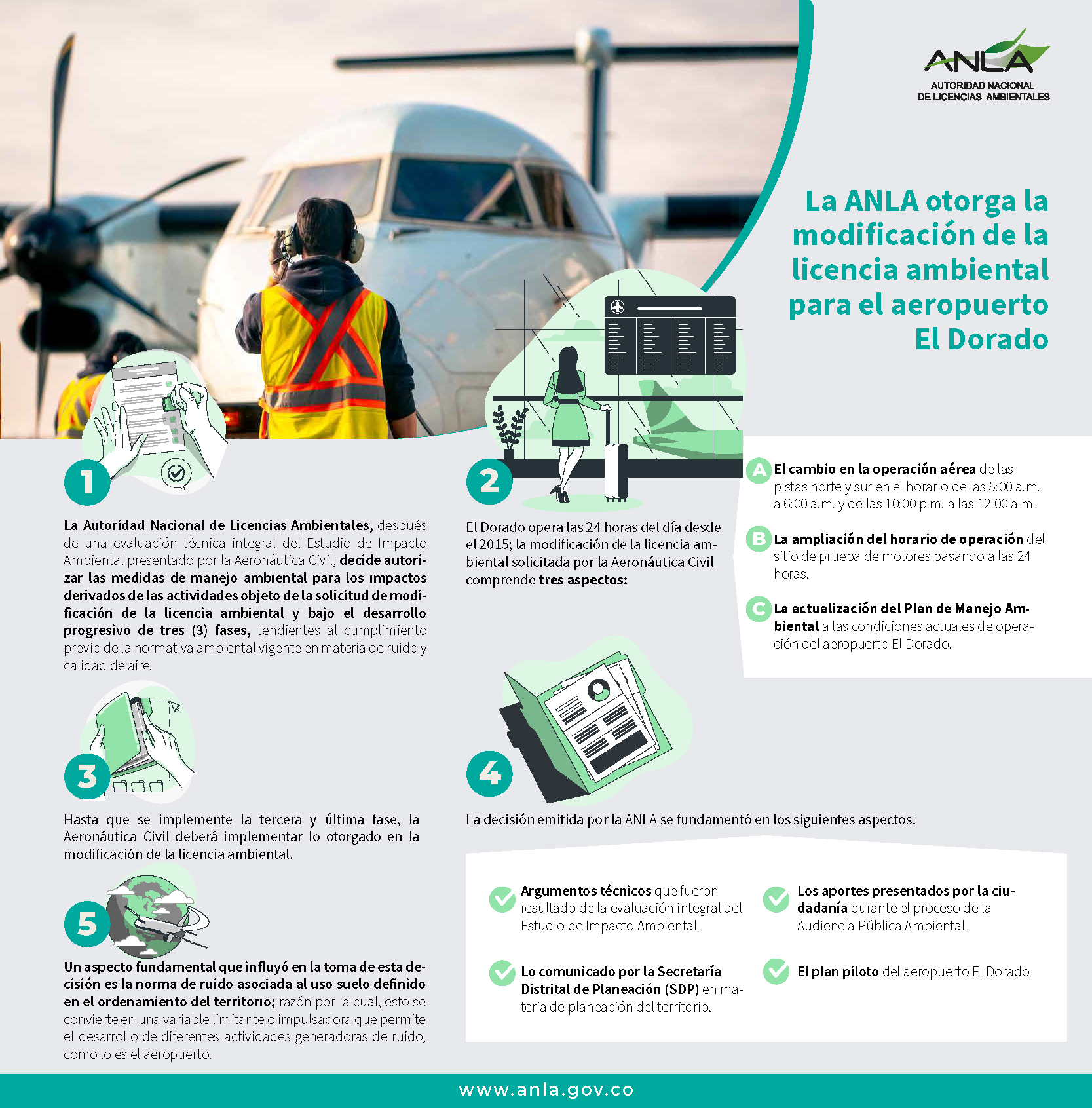 Es importante precisar que actualmente el aeropuerto El Dorado opera las 24 horas del día desde el 2015; la modificación de la licencia ambiental solicitada por la Aeronáutica Civil comprende básicamente tres aspectos: el cambio en la operación aérea de las pistas norte y sur en el horario de las 5:00 a.m. a 6:00 a.m. y de las 10:00 p.m. a las 12:00 a.m.; la ampliación del horario de operación del sitio de prueba de motores pasando a 24 horas; y la actualización del Plan de Manejo Ambiental a las condiciones actuales de operación del aeropuerto El Dorado.