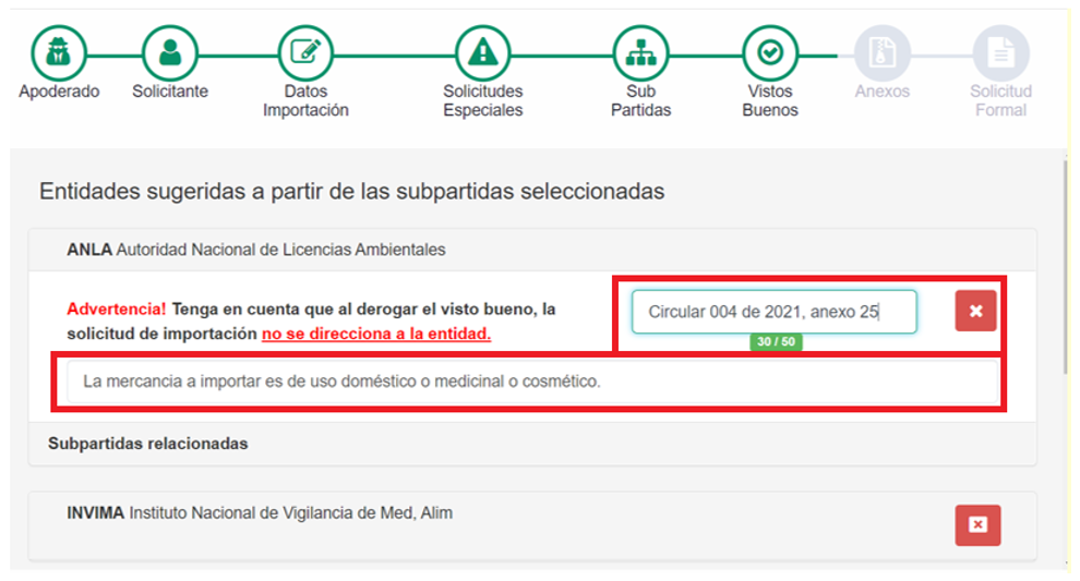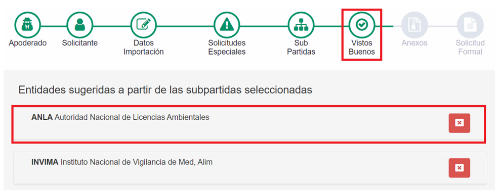 1. Una vez adicionada la subpartida arancelaria y la información del ítem, en el paso “vistos buenos” se listan cada una de las entidades competentes.