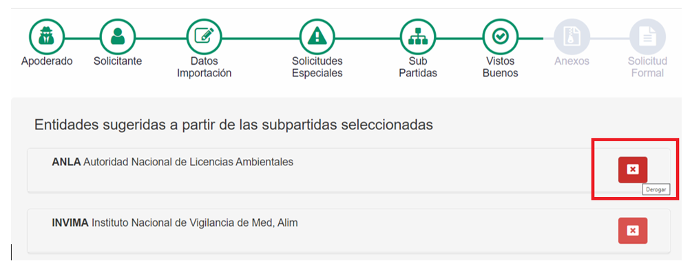 2. En este punto, deberá tramitar la exclusión del visto bueno de la ANLA, para lo cual deberá marcar la X del icono rojo.
