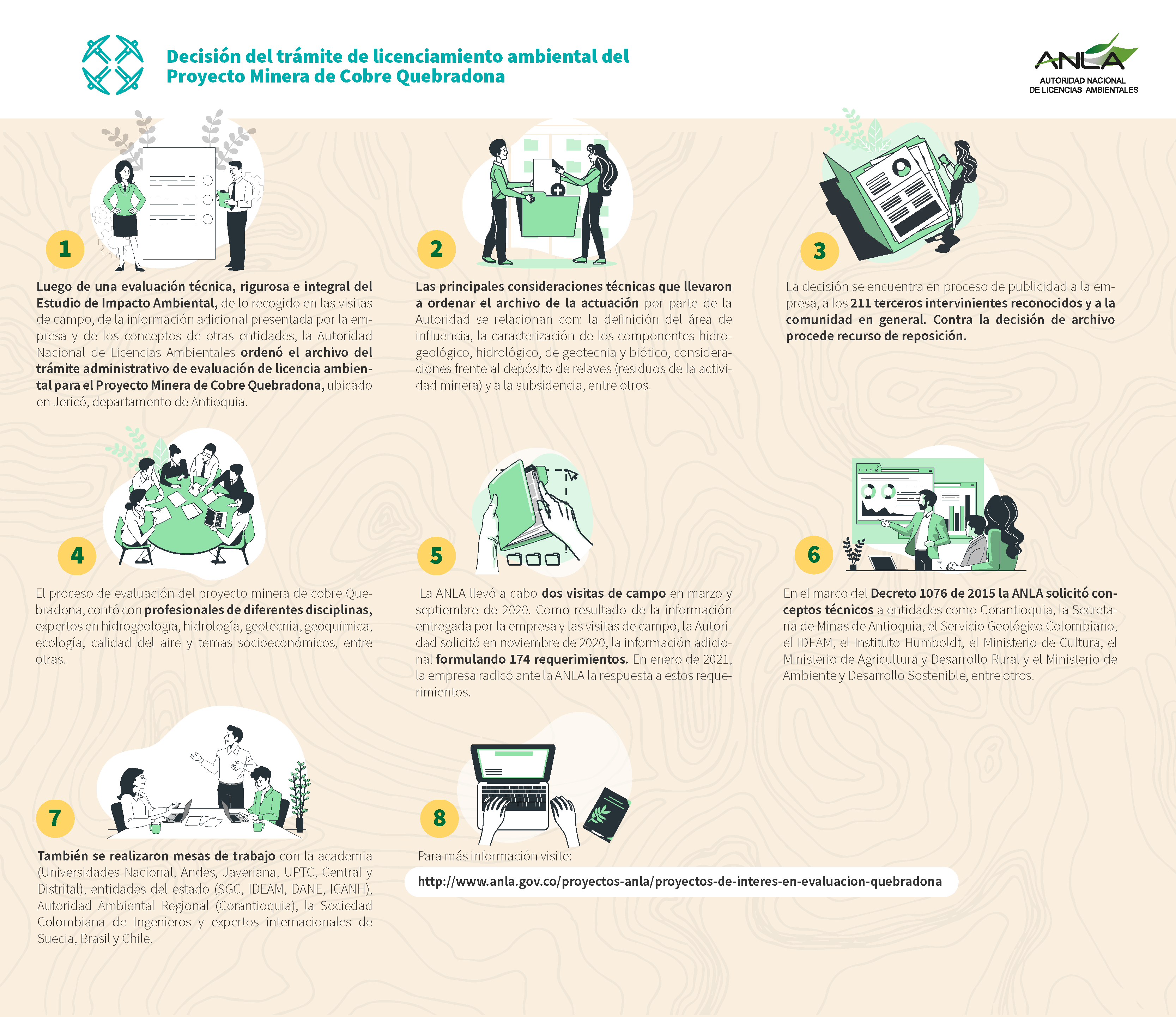Durante el proceso de evaluación del proyecto minero de Quebradona, la ANLA desarrolló dos visitas de campo en marzo y septiembre de 2020. Como resultado de la información entregada por la empresa y las visitas de campo, la Autoridad solicitó en noviembre de 2020, la información adicional formulando 174 requerimientos. En enero de 2021, la empresa radicó ante la ANLA, la respuesta a estos requerimientos.