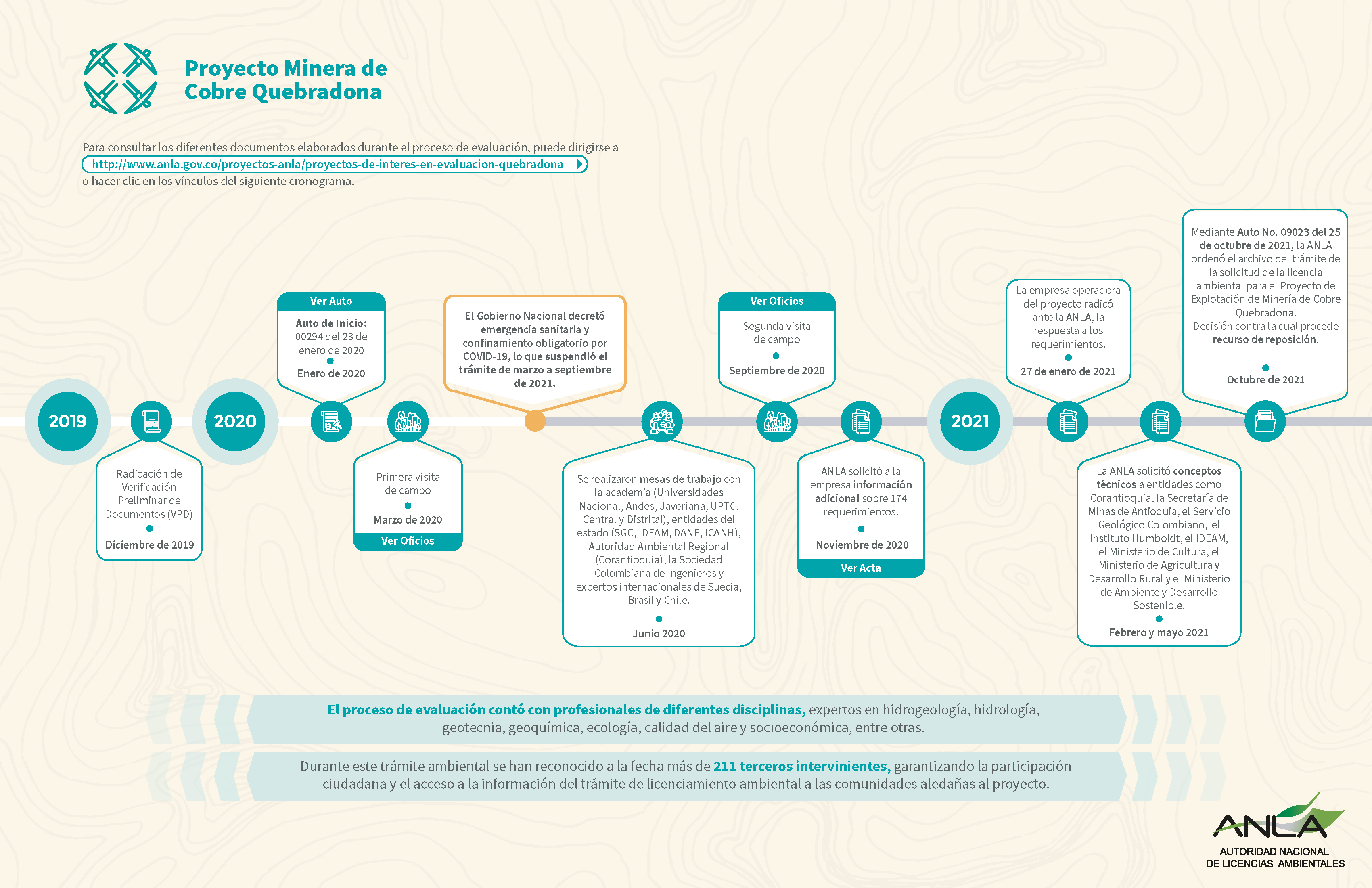 Bogotá, 25 de octubre de 2021. Luego de una evaluación técnica, rigurosa e integral del Estudio de Impacto Ambiental, de lo recogido en las visitas de campo, de la información adicional presentada por la empresa y de los conceptos de otras entidades, la Autoridad Nacional de Licencias Ambientales (ANLA), mediante Auto No. 09023 del 25 de octubre de 2021, ordenó el archivo del trámite administrativo de evaluación de licencia ambiental para el Proyecto Minera de Cobre Quebradona, ubicado en Jericó, departamento de Antioquia.