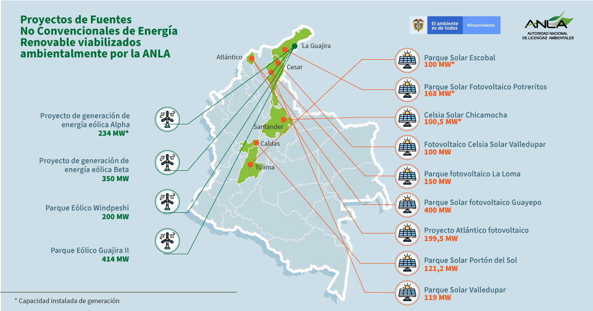 - Con esta decisión, son 13 las licencias ambientales que ha otorgado la ANLA de Fuentes No Convencionales de Energía Renovable (FNCER), que generarán 2.656 MW, superando la meta establecida por el gobierno nacional de 1.500 MW para este cuatrienio, lo que aumentará la confiabilidad del sistema eléctrico del país y con ello, la consolidación del proceso de transición energética en el territorio nacional.