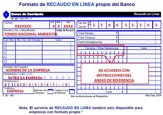 Una vez realizada la liquidación por parte de la ANLA, para efecto de realizar el pago por servicio de evaluación, informamos que el usuario se podrá efectuar mediante transferencia electrónica o consignación en el Formato de Recaudo en Línea (adjunto), siguiendo los siguientes parámetros: