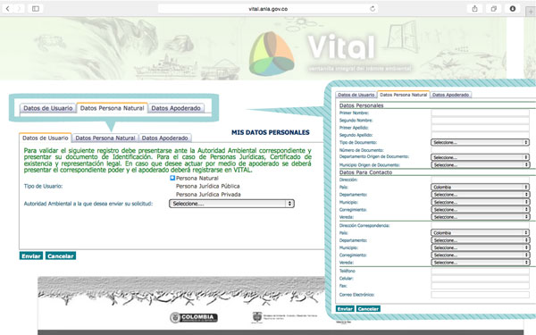 2. Diligenciar los formularios con los datos de identificación del usuario, seleccionando si es persona natural, jurídica pública o jurídica privada, y la ANLA como la Autoridad Ambiental a la desea enviar su solicitud. Asi mismo, diligenciar los datos de identificación del apoderado cuando aplique.