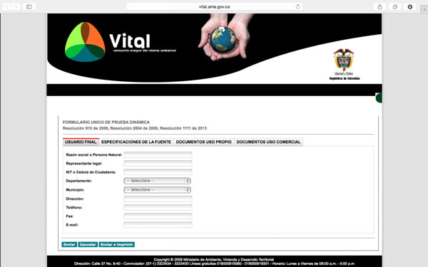 4. Diligenciar los formularios electrónicos de usuario final y especificaciones de la fuente, y adjuntar los documentos solicitados para uso propio o comercial según corresponda.
