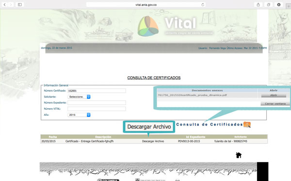 Por otra parte, el certificado generado puede ser verificado y descargado por el mismo usuario o un tercero de la siguiente forma: