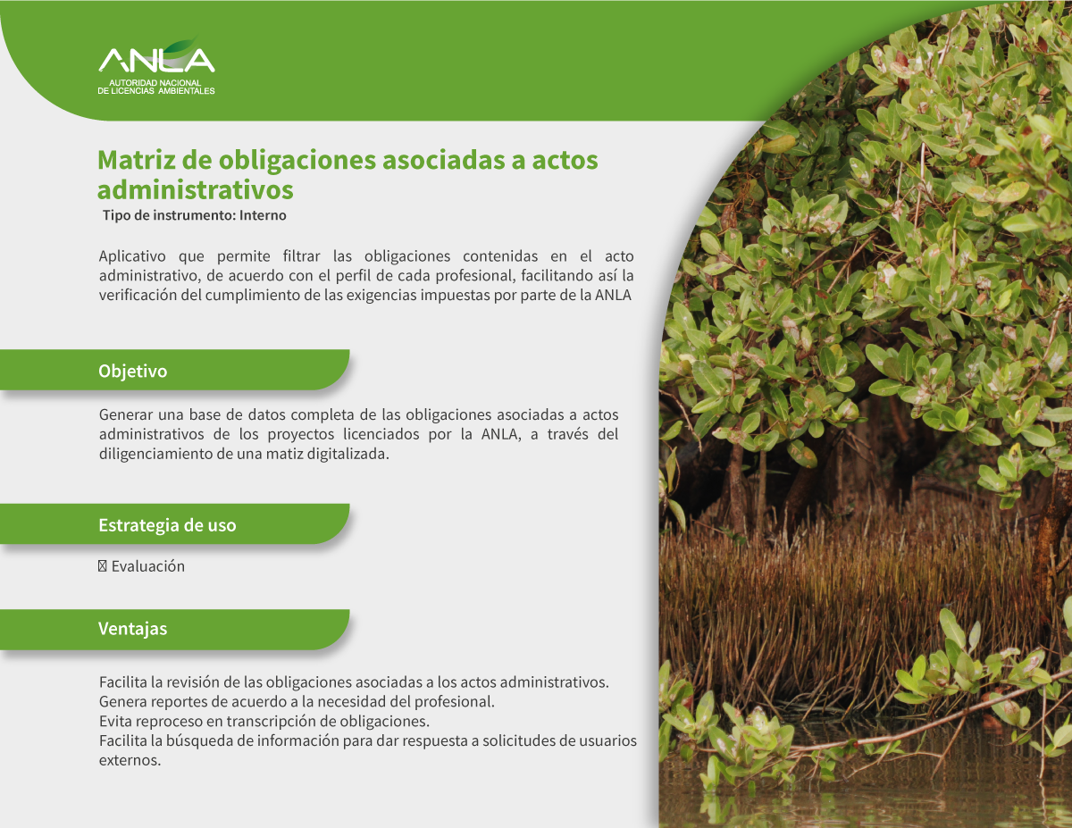 A continuación, se presenta información general de la “Matriz de obligaciones asociadas a actos administrativos”, instrumento de uso interno para el cual su consulta e implementación se limita a los profesionales de la ANLA.