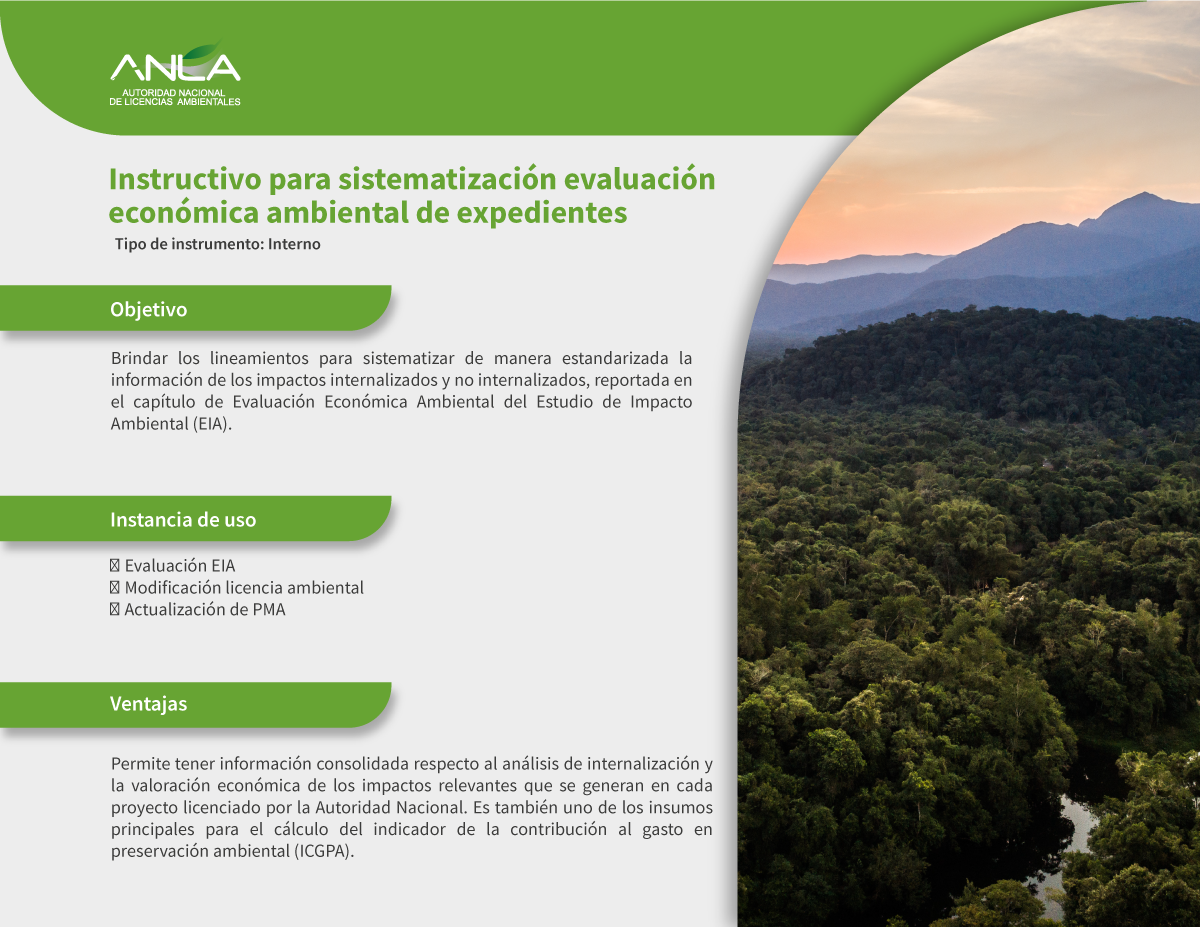 A continuación, se presenta información general del “Instructivo para sistematización Evaluación Económica Ambiental - EEA de expedientes”, instrumento de uso interno para el cual su consulta e implementación se limita a los profesionales de la ANLA.