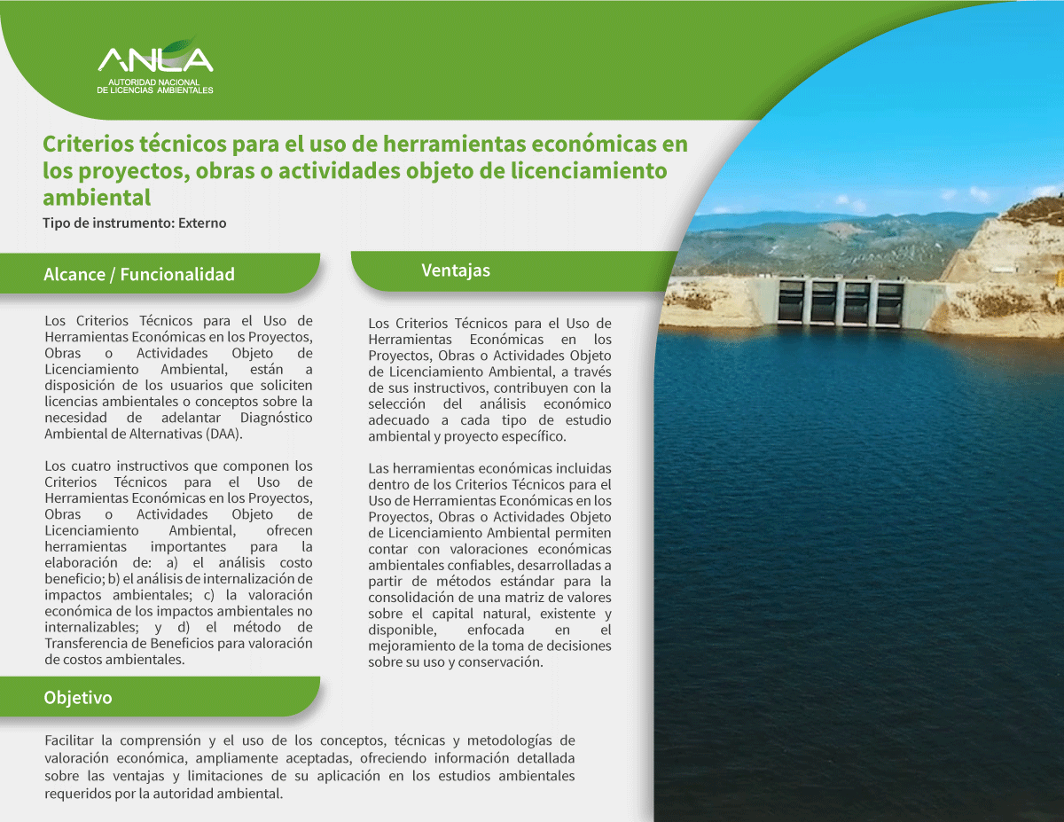 A continuación, se presenta información relevante del instrumento “Criterios técnicos para el uso de herramientas económicas en los proyectos, obras o actividades objeto de licenciamiento ambiental“ para facilitar su implementación por parte de los usuarios externos en la elaboración de los Estudios de Impacto Ambiental.
