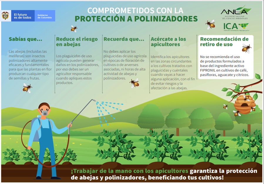 ANLA e ICA con el apoyo de AGROSAVIA desarrollaron el documento “PROTOCOLO PARA LA ATENCIÓN DE QUEJAS SOBRE AFECTACIÓN A POLINIZADORES DERIVADAS DEL USO INADECUADO DE PLAGUICIDAS QUÍMICOS DE USO AGRÍCOLA (PQUA)”.