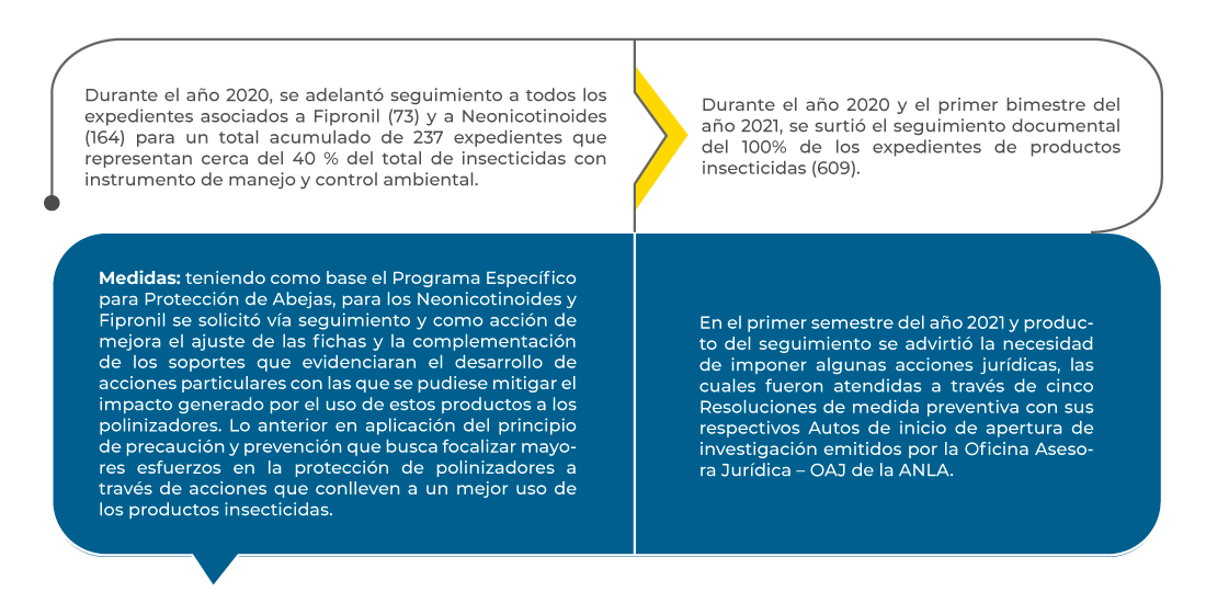 De esta manera, a partir del desarrollo de un tablero de control de productos insecticidas, esta Autoridad en el marco de la actividad de Seguimiento Ambiental ha logrado orientar de manera eficaz el seguimiento realizado a estos productos a través de esquemas de priorización que permiten direccionar el seguimiento a productos de alto interés ambiental como los son los insecticidas. Los resultados obtenidos a través del uso de esta herramienta se resumen a continuación:
