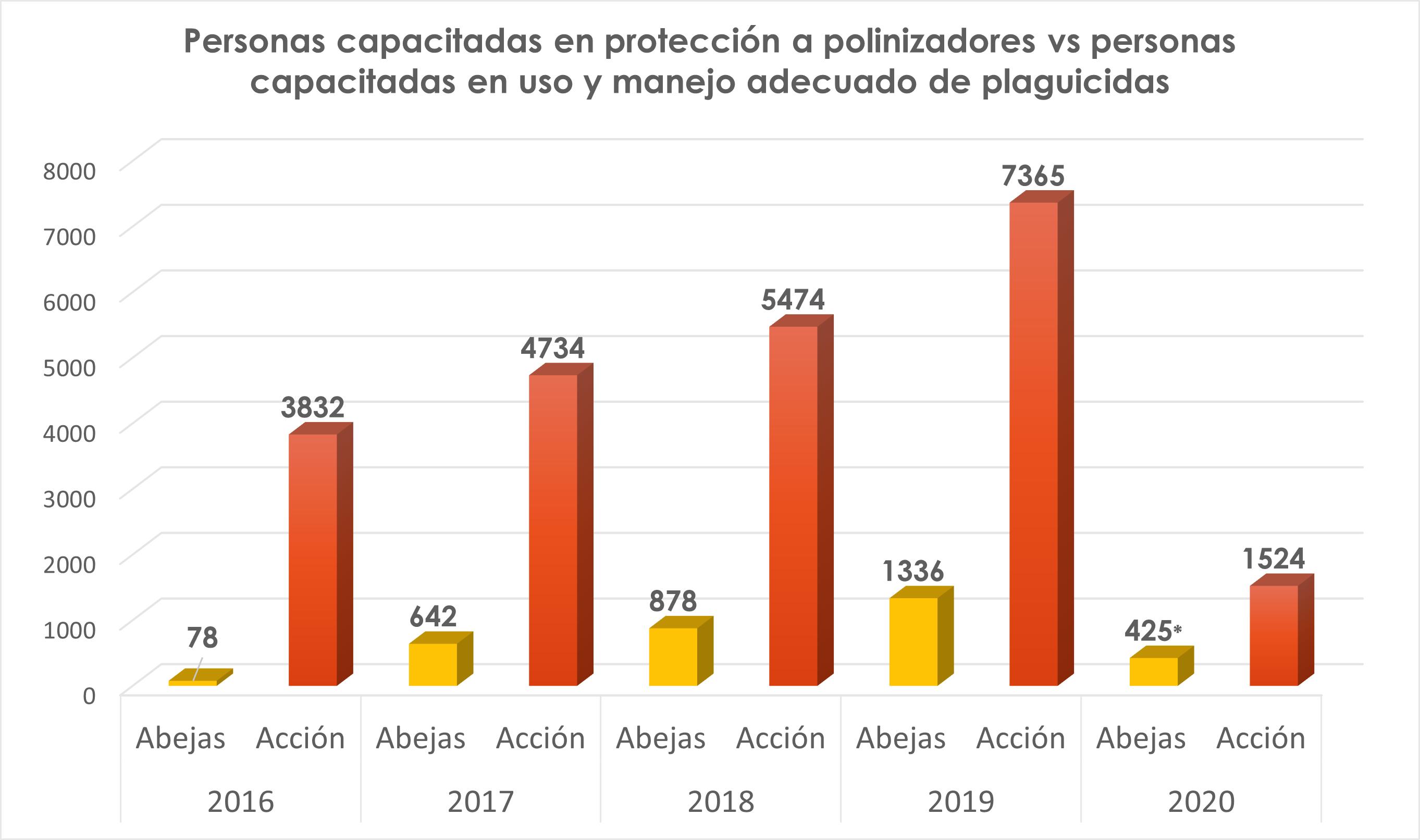Igualmente, como resultado del seguimiento realizado en el año 2020, se evidenció un aumento proporcional en el número de personas capacitadas en temas de polinizadores respecto a las capacitaciones generales en manejo de plaguicidas tal y como se evidencia a continuación: