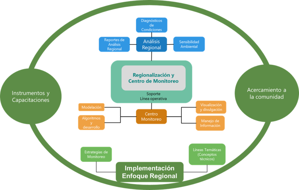 El grupo de Regionalización y Centro de Monitoreo cuenta con tres líneas de acción que responden a diferentes necesidades y momentos dentro de los procesos de evaluación y seguimiento de los proyectos obras o actividades sujetas a licenciamiento ambiental, así mismo generan diferentes productos y herramientas empleadas en la toma de decisiones.